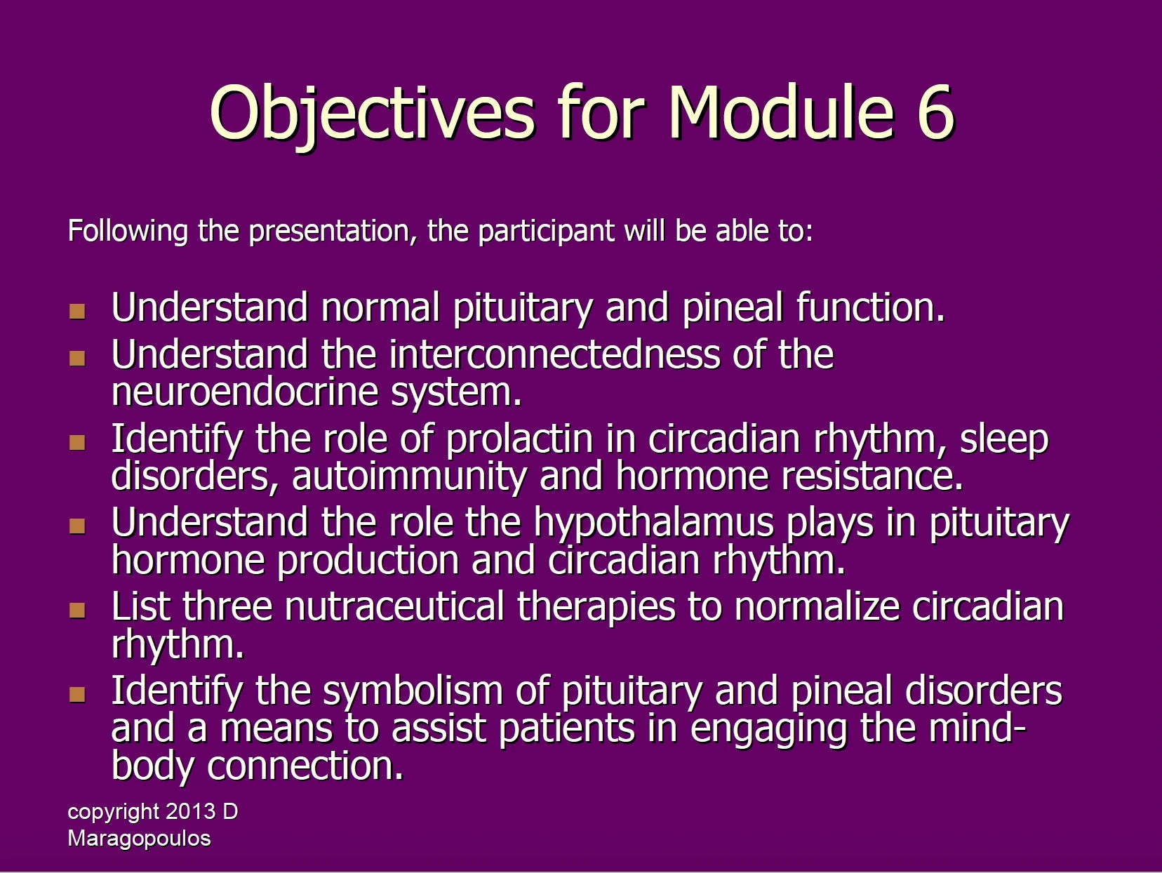 Module 6 — Sixth and Seventh Chakras: Pituitary and Pineal function- mood, learning, memory, sleep disorders and how to receive divine insight.